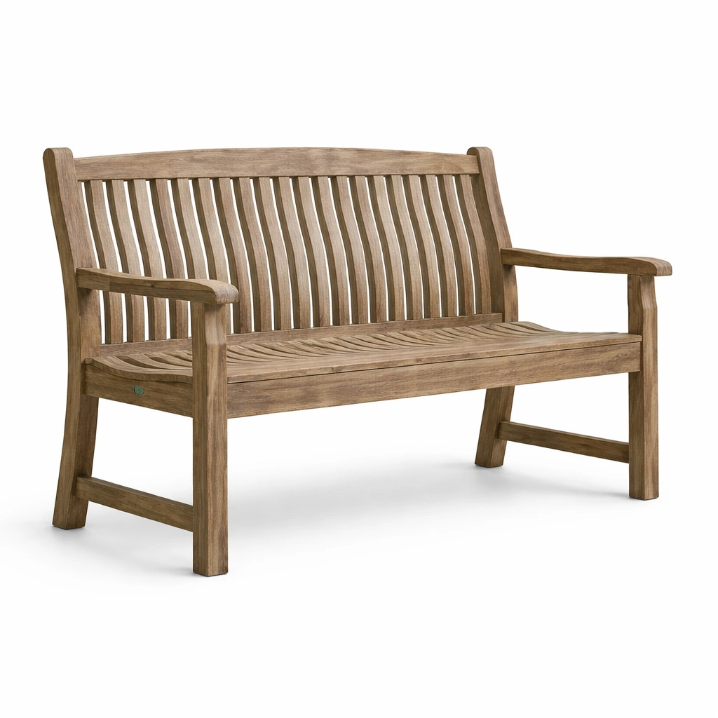 Banco de jardín hecho de madera de teca con acabado natural resistente a la intemperie. Sus dimensiones son 150 cm de largo, 60 cm de ancho y 88 cm de alto. Este banco tiene un peso de 20 kg y soporta hasta 250 kg.