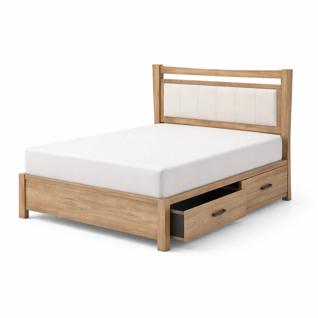 Materiales: Estructura de madera de roble, cabecero tapizado de poliéster, cajones con tiradores de metal